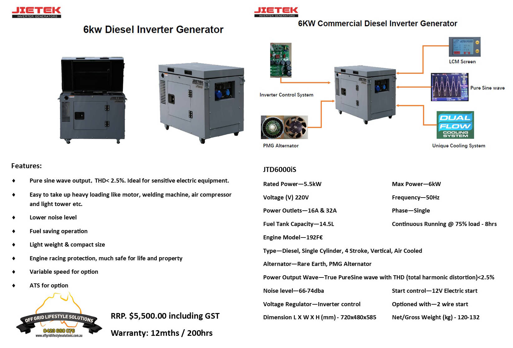 JieTek is dedicated to manufacturing high quality and silent diesel generator to the off grid market. Jietek have a strong R&D team and have developed world leading inverter tech that leads to excellent performance such as super strong take up ability, fuel saving based on inverter variable speed, THD <2.5%, power factor high to 0.95 etc. Off Grid Lifestyle Solutions currently offer 3kW to 30kW diesel units.